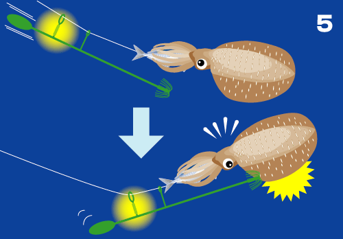 ヤエンが到達したら殆どのイカは驚いて走ります。そのまま逃げ出すことも、向こうアワセで掛かることもあります。少し待ってみてなにも起こらない場合は、張っていたラインをフッと弛めてから張りなおすと、掛け鈎が跳ね上がってフッキングします。グイグイと小刻みなアタリが伝わってきたら、竿を立てて常に一定のテンションをかけたまま、弾性を利用して足元まで寄せてください。
