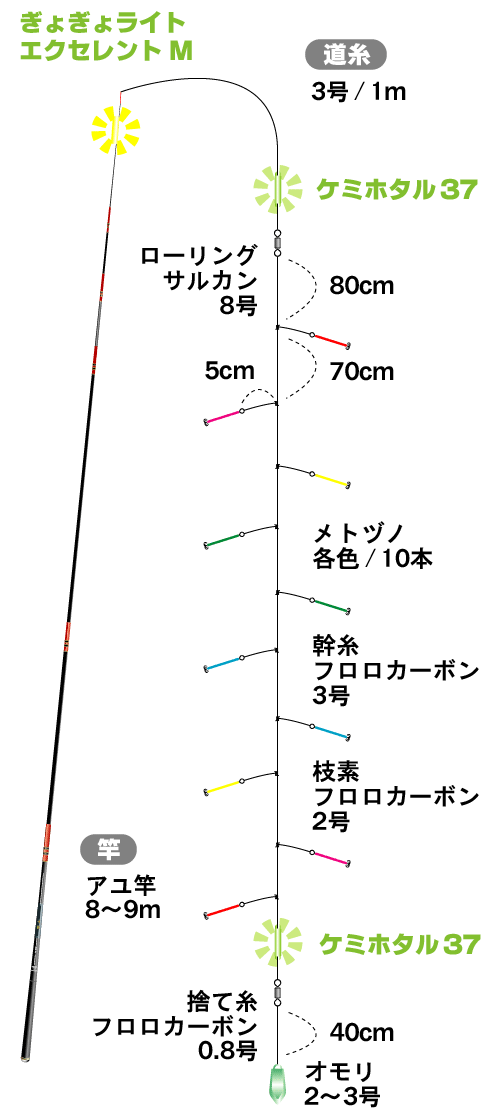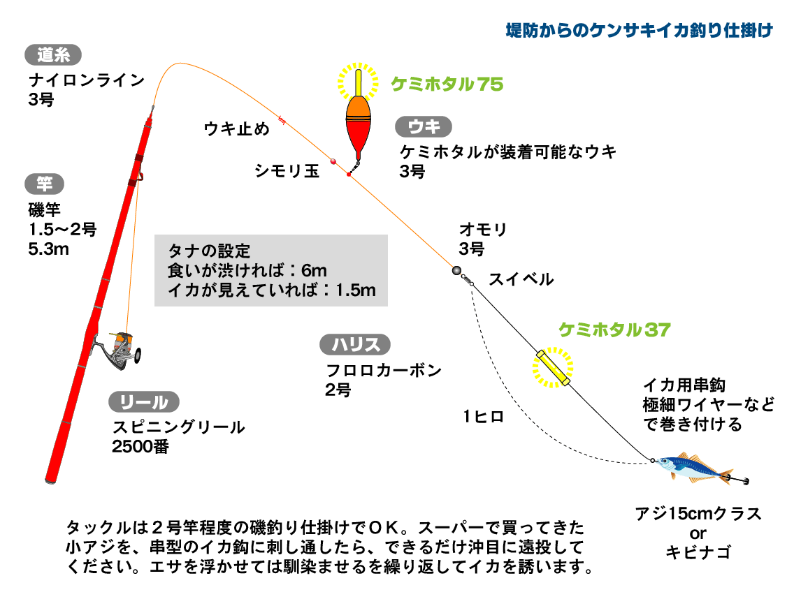 特徴は堤防釣りにしては異例の長竿を使うことと仕掛けにある。竿は昔からアユ釣り用の竿を使用する。長さは8~9m。仕掛けの全長が長いためと、イカが岸壁までは寄って来ないからだ。