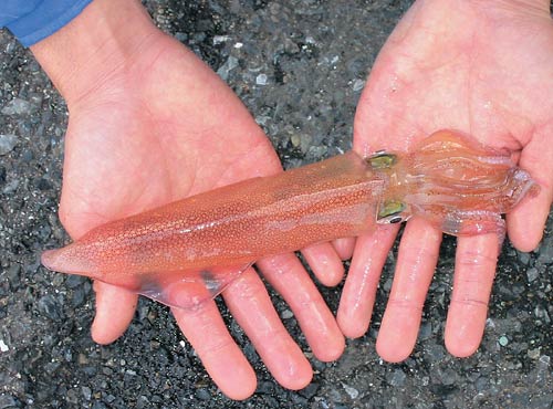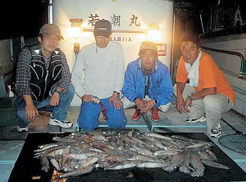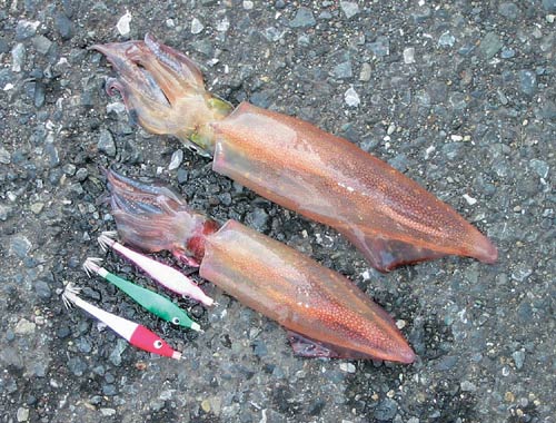 大型は2~3㎏以上になり、「 引き 」が楽しめる。スルメイカ同様、強い光の点滅式ライトが必需品。水中集魚ライトM型、C型 がお勧めだ。