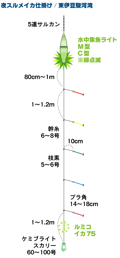 「 本場 」茨城では鉛スッテ+浮きスッテ仕掛( 下図 )で秋~冬に、05年より乗合がスタートした駿河湾は浮きスッテのイカサビキ( 胴突式 )で夏場に釣る。