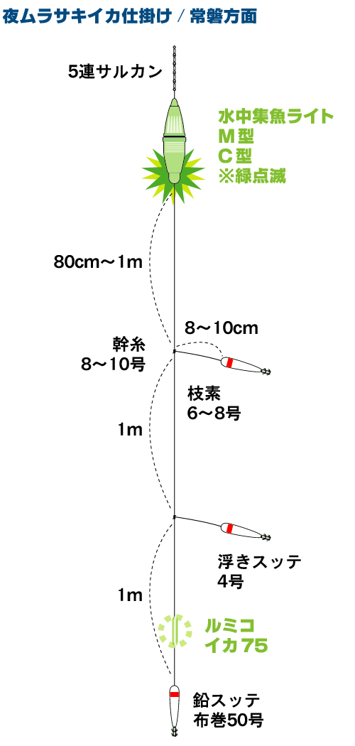 イカサビキは日中と同じ物を使用するが、水深は数十mと浅く、錘が軽量となる。発光体に関してはアカイカに準ずる。