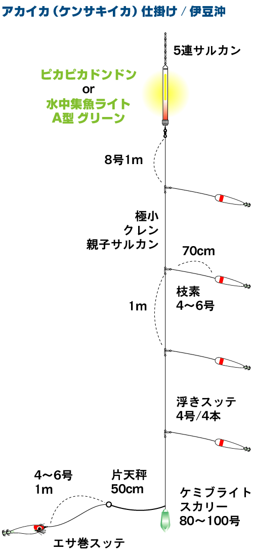 標準和名ケンサキイカを伊豆ではアカイカと称する。伊豆諸島の重要産業種であり、遊漁は釣場限定で許可される。晩春~初夏が盛期。浮きスッテのイカサビキが基本だが、乗り渋りには下部に餌巻きスッテを配す。