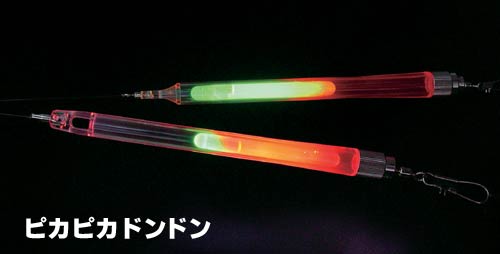発光体を使用する場合は、前出2種のイカよりも弱めのアイテムをセレクト。ピカピカドンドン + ケミホタル 、若しくは ケミホタル75~100サイズ を仕掛上部にセットする。但し、サメが回遊している場合は速やかに取り外す配慮を。