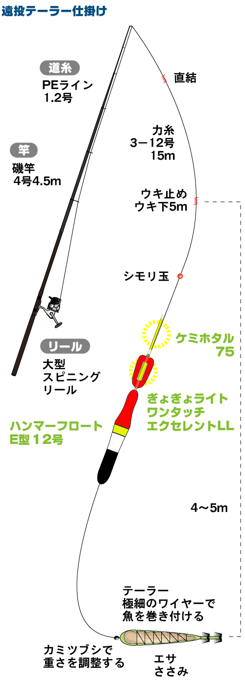 当初、試作品を手渡された頃は、投げ専門のタックルしか持っていなかったため、現場では毎回、四苦八苦した。と言うのも、イカが多少は乗るが、投げ専門のタックルではどうにもバランスが悪いのだ。そこで ハンマーフロートF型 に合わせたタックルを用意し、久しぶりに投げ竿を磯竿に持ち替えることにした。同時にテーマを決めて、それを目標にした。