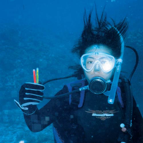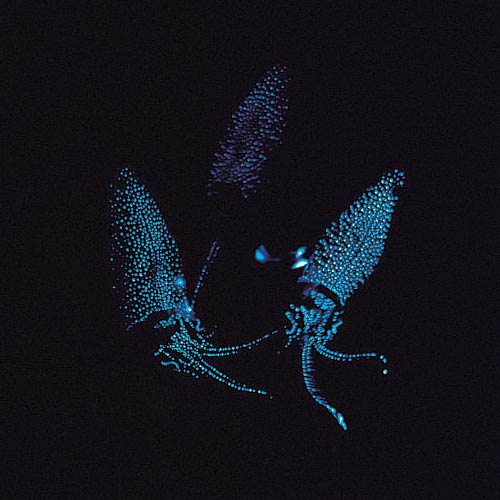深い海中は、水や浮遊物による光の吸収と散乱のために480nm( ナノメートル )を中心とした青い単色光の世界です。もしその水深に青い光だけしか存在しないなら、黄色や赤の物体でさえ青と黒にしか見えません。自から発光する物体だけに色彩を表現することが可能です。