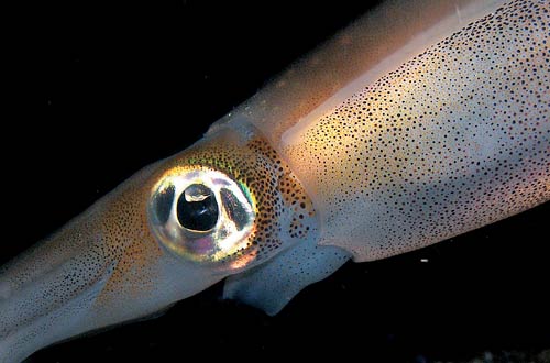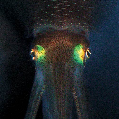 アオリイカは英語で bigfin reefsquid または oval squid または big-eye squid と呼ばれる。眼が大きく、周辺が緑色に発光するのが特徴。