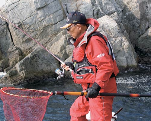 こうすることでマダイに竿尻を向けることになり、竿の弾力を100パーセント生かせるのだ。大物とのやり取りは足腰を安定させていないと力負けする。また、長期戦になって両腕だけで対処すれば、体力を消耗するので磯際へ寄ってきたときには、疲れ果て思わぬ不覚を取ってしまう。そのためにも沖では腰でやり取りして体力を温存し、手前に来たら両腕を伸ばして全力で取り込むことだ。