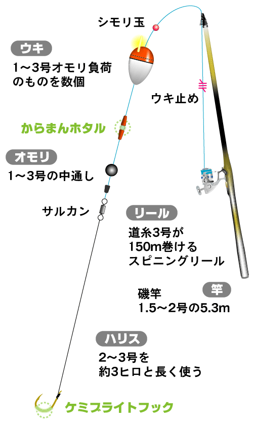 ウキ下は竿2~3本が標準なので、ウキはオモリ負荷1~3号のものを状況に応じて使い分ける。