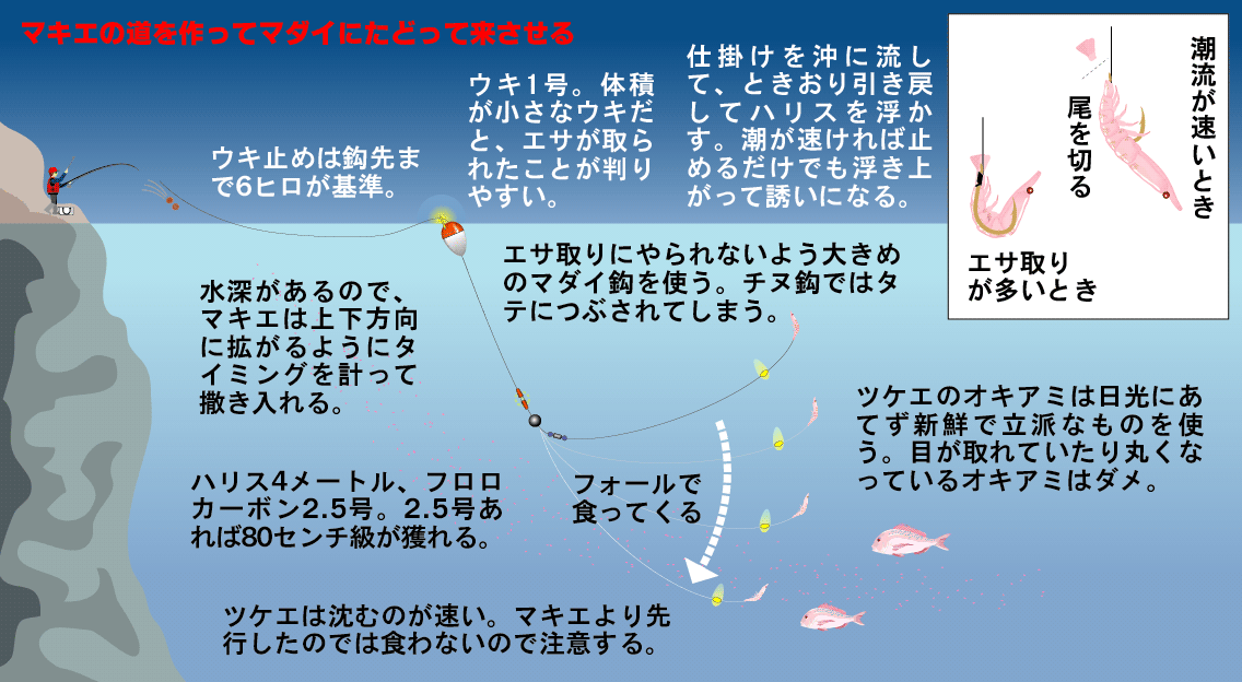 マダイ釣りのマキエはグレ・チヌ釣りのマキエとは一線を画する必要がある。グレ釣りのマキエは間断なく小量で、それに仕掛けを合わせて流していく。ところがマダイ釣りでは一度に多くのマキエを入れ、それに仕掛けを合わせて流していく。