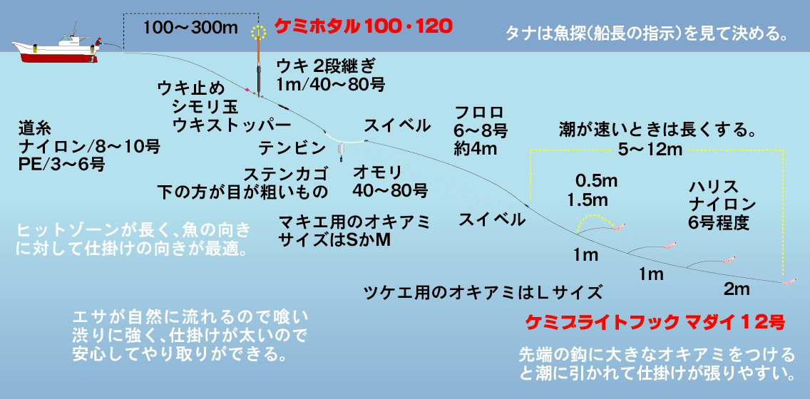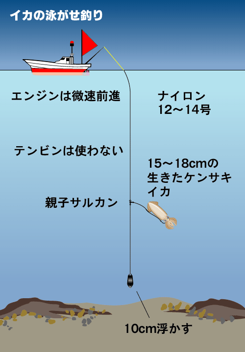 別名を「 イカ流し 」とも「 イカの落とし込み 」ともいい、マダイのほかアラ( クエ )やヒラメを狙える人気釣法です。春から秋にかけてイカを常食しているマダイを、スパンカーを使って船の向きを一定に保ったまま、イカの集合場所を狙って流し釣りします。