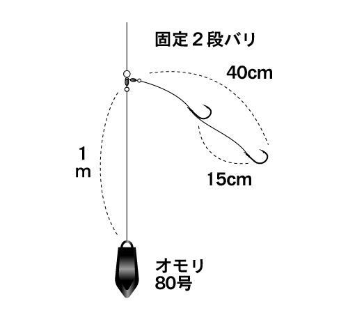 ただし、エサのイカがヤリイカとスルメイカではタナの取り方を変える必要があります。ヤリイカは水平に泳ぐので問題ありませんが、スルメイカは下に潜ろうとするので、タナをやや上に設定してください。