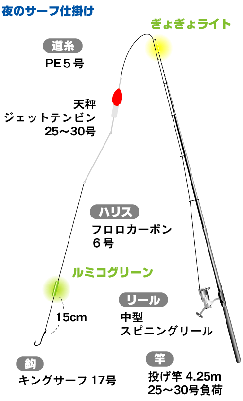 夜のサーフはドカンと一発大物のチャンス!砂浜が岩場と隣接しているような場所ではサーフにチャレンジしてみましょう。エサはイソメかユムシ。エサの上15cmには ルミコ か、超小型の ちもとホタル をセットしてください。