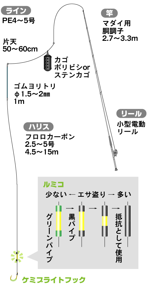 発光アイテムは深場や濁り潮に有効なギミックであり、この釣りでは「 ケミブライトフック 」と「 ルミコ 」が活躍する。ルミコに付属しているブラックパイプ を活用すれば、潮の明暗、餌取りの多少で発光部分を調整可能。極端に餌取りが多いなら、全てをマスクして ルミコ を「 発光体 」ではなく、「 抵抗 」としてのみ活用する方法もアリだ。