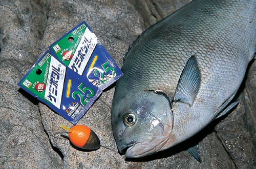黒い体(*註2)は暗い場所での保護色であり、両者はもともと暗がりを好む性質を持っています。そのため若魚の間は昼行性がつよくても、大きくなるにつれて昼間はエサを追わず岩陰に潜んだままになり、だんだんと夜間の移動や摂食活動が増えてきます。 夜間であれば、いくら眼がよくて物の形状を見分ける能力が高いグレといえども、ハリスを見破ることが難しくなります。昼間だったら2号を軽くブチ切っているはずの大物にも余裕の太仕掛けで対応可能。海の中は地上よりも視界が効かないため、障害物の多い磯を全速力で奔りまわって抵抗することも出来ません。だから夜は大物が釣れるのです。