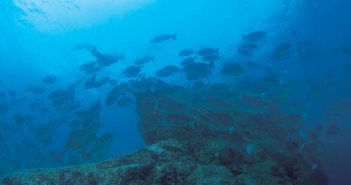 喰いがたてば何10kgもの大釣りになるのがグレ釣り。グレの群れはイワシの群れほど厳格に統制されておらず、たえず分裂と合流、離散と集合を繰り返しています。群れをつくる魚には、仲間との間隔を視覚に頼らなくても自動調整できるように、人間には到底聞こえないレベルのごく僅かな水の振動を感知する能力が備わっています。磯の岩盤や海水には低周波音を伝えやすい性質があり、グレには低周波音を聞き取る優れた能力があるため、瀬際で不用意な物音を立てると警戒されることになります。