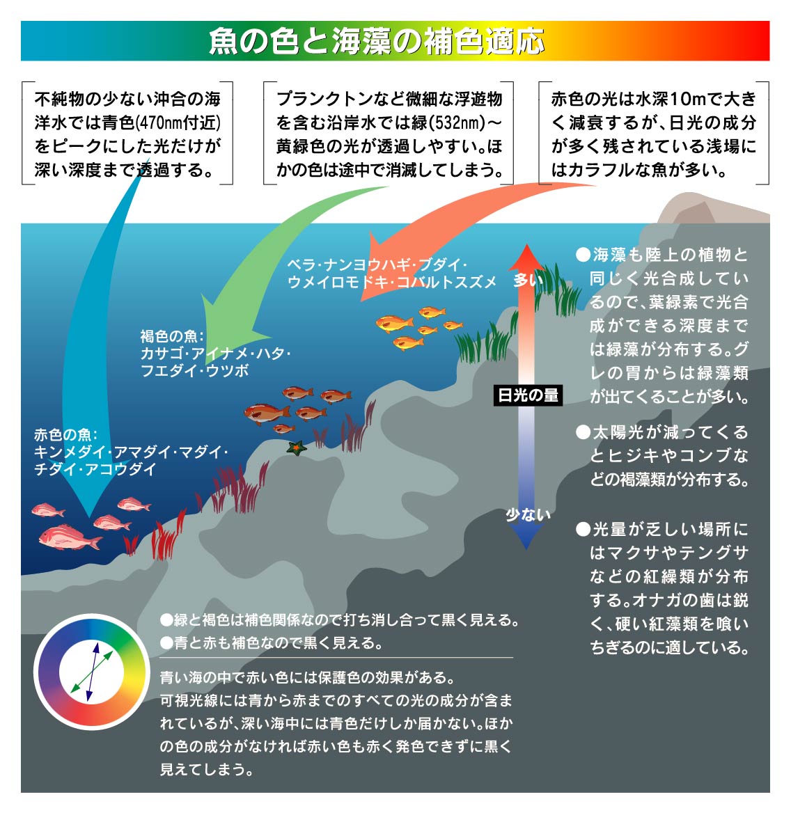 【 註2 】皮膚にはメラノフォアと呼ばれる黒い色素胞が存在する。眼からの神経は全身の色素胞に繋がっており、砂地のような明るい場所では縮まって体色が白っぽくなるが、岩棚など暗い場所に潜むときには広がって黒くなる。全体的に夜間は黒っぽく、昼間は薄くなる傾向があり、釣り上げたときには海に溶け込むエメラルド色でも、死ねば色素胞が弛緩して黒く変色する。