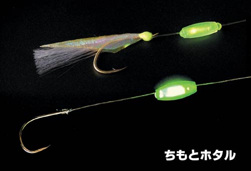 マズメや夜間には夜光素材を使ったものが有利です。アジの視界が制限されている海中で、どれが目立つかを考えて選ぶといいでしょう。ケミホタル の発光色と光量がアジに警戒されることはありません。使って逆効果ということは絶対にないので、小さい ケミホタル は喰わせ用として鈎近くに、大きな ケミホタル は遠くからの集魚用として鈎から1mほど離れた場所にセットしてください。