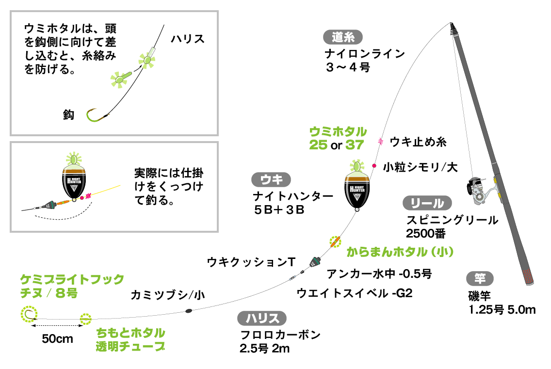 通常の夜釣りならウキ下は2mのハリスだけで充分である。ウキ止めをウェイトスイベルの真上まで下げ、ウェイトスイベルの上にウキクッション、上にアンカー水中ウキ、その上にからまんホタル、また上に小粒シモリ玉、その上にウキ止め糸と、ガッチリ固定された仕掛けセッティングがベストである。それでも季節や水温によってはウキ下が若干深くなることがあるので、この図のようにその場に応じて調節可能な仕掛けにしている。