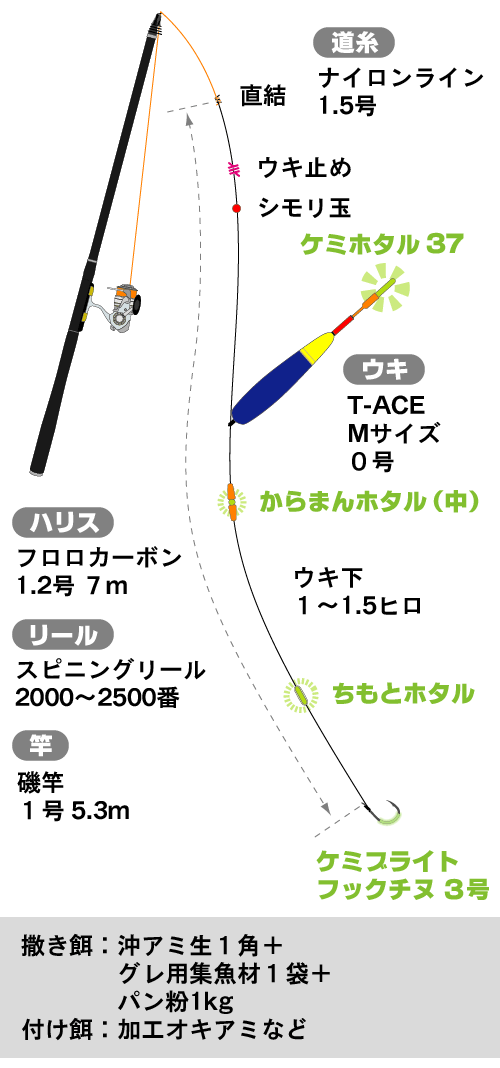 時合いはやはり朝夕のマズメになるので、自重があってよく飛ぶウキと ケミホタル を用意してください。撒き餌にパン粉を入れるのは水分を吸収させるためです。ド遠投できるように時間をかけてしっかりと練り込んでください。もちろん撒き餌ヒシャクも遠投用。付け餌も身切れしにくいものを用意します。