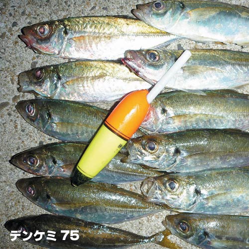 マズメ時にはいかにアジに餌を見つけてもらうかが釣果の決め手になる。カゴにデンケミを取り付けると、真っ暗な海中でもコマセがよく見えるためヒット数が飛躍的に増える。これのケミホタルバージョンがアジホタルである。