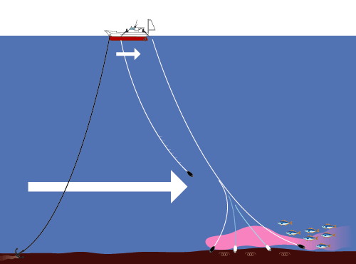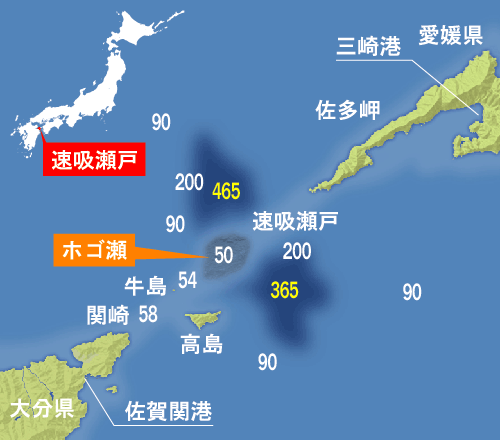 佐賀関と、対岸の愛媛県佐多岬をつなぐ線上のほぼ中央に「 ホゴ瀬 」と呼ばれる主要漁場があります。ホゴとはカサゴの地方名。最浅部は50m程度なのに、わずか5kmほど南は365mの水深があり、5kmほど北は465mの深いツボになっています。岬の張り出しで巾が狭くなっている上、斜度8%の駆け上がりに5.9ノット( 時速約11km )もの急流が当たるため、潮の流れが非常に速く、複雑な海底の地形もあって網を入れることが難しい海域です。そのため昔から一本釣りの漁場とされてきました。