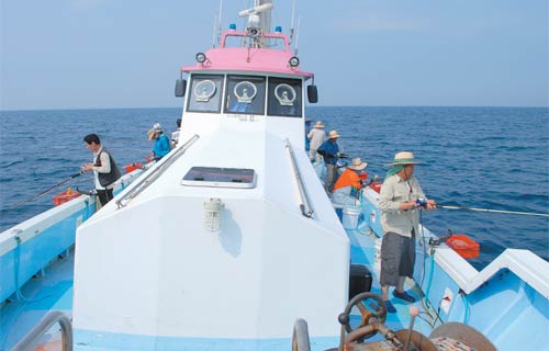 流し釣りの場合、先にポイントに入る船首の釣り座が有利になりますが、アンカーを打ってかかり釣りするときは、船後方の釣り座に分があります。潮下から寄ってきたアジが撒き餌の広がる場所に群がって足止めされるため、前方にいる人には釣れにくいものですが、潮さえ緩めばチャンス到来です。上手から仕掛けを入れるのでオマツリが起こりにくく、逆に釣果が上回ることがあります。