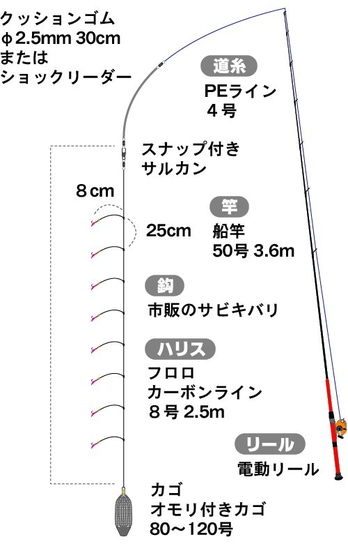 水深が深いとき、潮が速いとき、および竿が硬いときにバラシが多くなります。巻上げるときのショックを柔らげる役目のクッションゴムですが、ビョンビョンとした伸びが気になる人は、5~8号のナイロンラインを5~10mほどリーダーとして代用してください。PEとリーダーの結び目が大きくなるとガイドを通らないので気をつけてください。