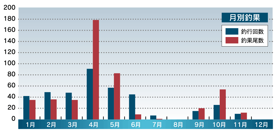 夏が近づくと沖に出てしまうため、6月からの釣果は急激に落ち込み、7月はたったの1匹。8月にいたっては釣行ゼロです。夏が過ぎて9月になると15回で20匹と回復し、10月は26回の釣行で54匹を仕留めています。グラフには表れませんが10~11月は産卵前の荒食い時期となり、良型揃いなのが特徴です。12~1月は産卵のためまた外海に出るので釣果はよくありません。
