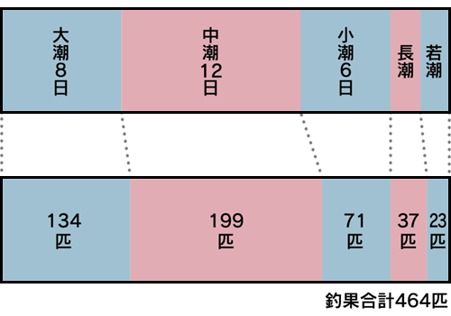 月の朔望1サイクルのうち、大潮と中潮の20日間 ( 66.6% ) で全釣果の71.8%に相当する333匹が釣れています。これは他の魚種にも見られる一般的な傾向ですが、やはり大潮~中潮には成績がよく、潮があまり動かない小潮~若潮は釣れにくいことが裏付けられました。( ただし例外的にアオリイカなどは遊泳力が弱いため、潮の速い日は釣れにくく、潮が緩むと喰いが立ちやすい傾向があります。 )