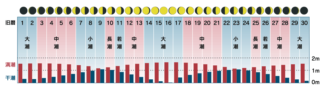 全体的な結論としては、2~6月にかけての大潮から中潮の潮回りで、満潮から下げに向かう時間帯がベストということになります。暦を見れば釣果を得やすい日を割り出せるので、まず潮回りで釣行日を決め、次に上げ下げの潮汐度で竿出しの時間を決めます。さらに水温と水深を考慮してポイントを絞り込んでください。
