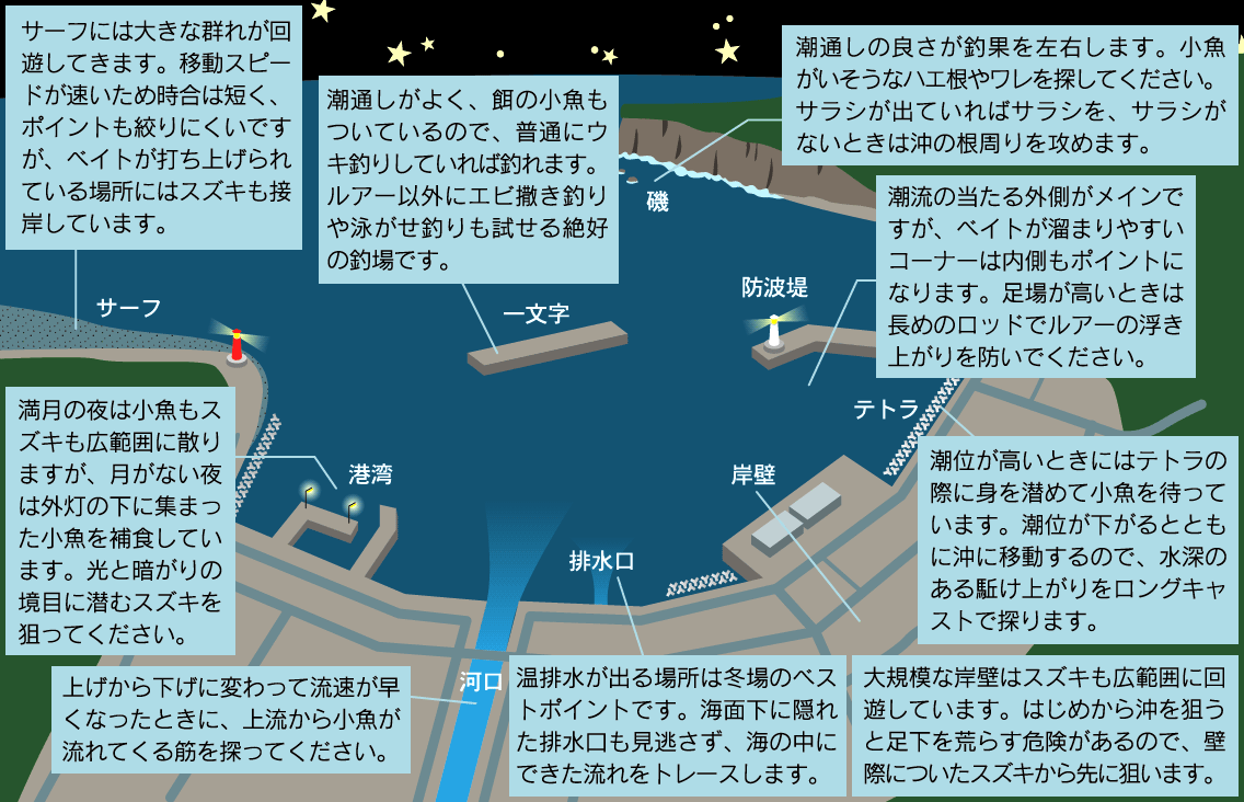 海の魚は一年間の水温の周期的変化や、約30日間の月光量と潮汐のリズム、および毎日2回の干満のリズムの影響を受けて生活しています。スズキの場合はさらに、河川の流れ込みや潮流による流速の変化、天気や日射量による日ごとの水温変化、プランクトンと酸素量、雨による突発的な水位の変化、ベイトの種類や量、海中の明るさなど、じつに様々な外的要因に応じて頻繁に居場所を変えます。