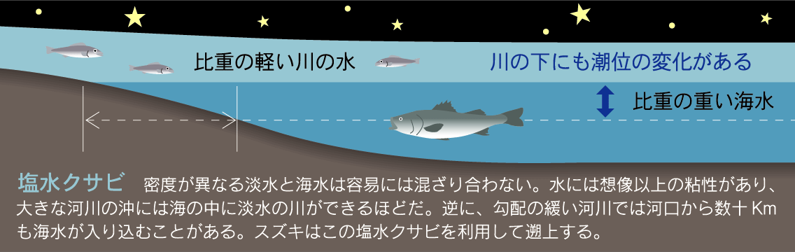 スズキは本来海水魚であり、純淡水域まで遡上できると言っても、実際には塩水クサビを利用していることが多いようです。堰のない大きな河川では100kmにも達するという、川底の塩水層を辿って遡上しますが、この塩水クサビは潮汐の影響を受けて、日ごとに到達距離が変化します。潮位が低いときにはあまり上流まで行けないはずだし、潮位が高いときには、それを見越して上流のポイントを設定することができます。
