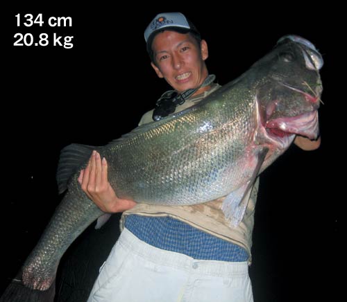 マルスズキの日本記録は大分県の堅田川で釣られた126cm、13.14kgです。この川と合流する番匠川で2008年に134cmのタイリクスズキが上がりました。釣ったのは当時高校二年生の下川くんです。秋雨前線が通過した直後の夜8時半、ニゴリの中でフッキングさせ、近くの釣人の手を借りてようやくランディング。計量のため行きつけの釣具店に持ち込んだところあいにくの店休日です。つぎの釣具店では秤 ( はかり ) を振り切ってしまいました。このお店で冷凍をお願いし、後日60km離れた別の釣具店まで持って行きましたが、ここの20kg計も振り切る有り様。スタッフの方に支店に置いてあるクエ ( アラ ) 用の50kg計を運んできてもらい、再計測したところついに20.8kgとの結果が出ました。