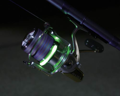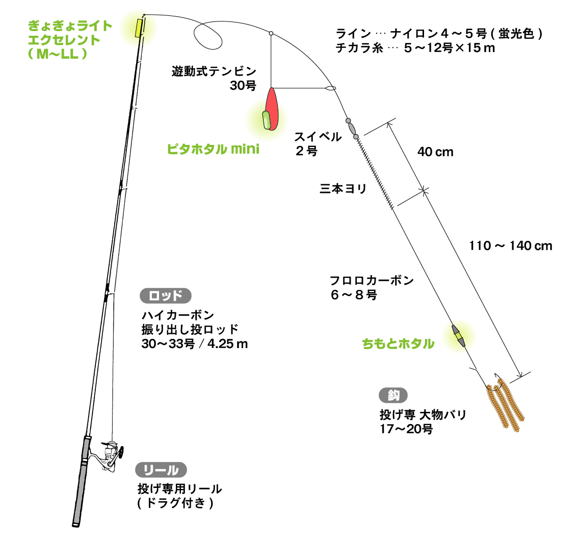 リールはアタリの強さに応じて自動的にラインを送り込め、食い込みにアドバンテージを発揮する「 ドラグフリー 」が使えるドラグ付きの投げ専リールが適している。そのスプールには夜釣りでも視認性の高い蛍光ナイロンライン4~5号を巻き、オモリにはアタリが大きく出て食い込みに有利な遊動式テンビンの27~30号を選びたい。
