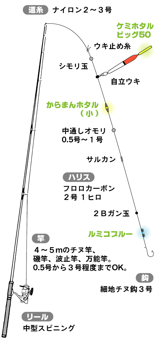 感度優先にしたいときは棒ウキ+ ケミホタル の組み合わせでトータルの質量を軽くします。浅いタナまで浮いているときは固定にしてウキ下を短くしてください。