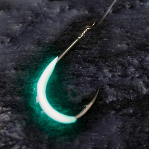 仕掛けは全長150~180cmのフロロ6~8号に、大物用投げ専バリ15~18号を結んだシンプルなタイプ。ただし、チモト部分にルミカの「 ちもとホタル 」を装着するのがミソである。