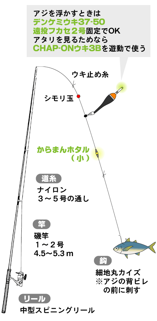 ウキを使って流すときは、アジが根に入れないくらいのタナに設定します。泳いでいくアジがウキを引き込んでアタリと間違わないよう、やや浮力のあるウキを選んでください。