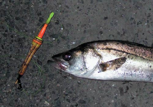 スズキの引きには重量級のパワーがあります。しかし、円筒型の体型から想像できるように2号ハリスをブチ切るほどの瞬発力はありません。落ち着いて対処すればクロダイ竿でも取り込めるので、タックルも釣場もクロダイ釣りと同じ感覚で楽しむことができます。ただし、クロダイはベタ底狙いが基本で、夜間でも壁や係留ロープなどの拠り所がないと浮き上がってきません。スズキはベイトの層や明るさによってタナが変化します。餌を探すときは海底から1~3mのスズキ道を回遊するようですが、漁師さんや水族館の飼育員さんの話だと、普段はサメの泳層を避けて表層1mを泳いでいるそうです。ベイトの泳層と明るさ、水深によってその日のタナを推理しながら釣る必要があります。