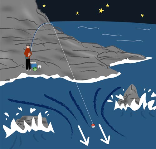 もしなにかコンストラクションがあるようなら、いったんその向こう側まで遠投してからポイントの上まで引いて来てください。フィッシュイーターは動く物体に反応します。潮と同調して流れるのは木クズか流れ藻だから喰ってきません。