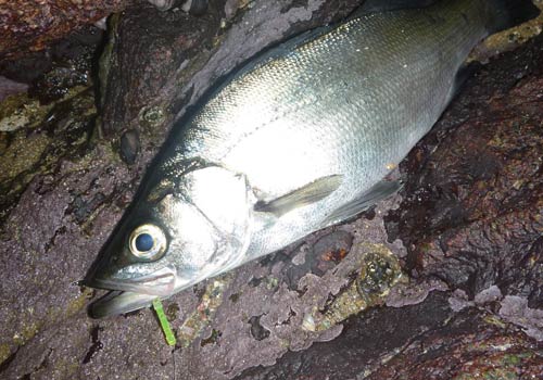 ポイントがグレ釣りの磯と重なっている場合、夜間の活性が高いヒラスズキがよく夜グレのゲストとして釣れてきます。これは生きエビを好むヒラスズキが撒き餌のオキアミに餌付いているからです。グレはオキアミが潮と馴染んで自然に流れないと喰ってきませんが、スズキは仕掛けを操作するときの動きが誘いになって喰ってきます。