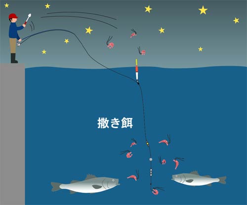 太陽光線が充分届く浅場には植物プランクトンが発生し、それを食べるエビや小魚が棲息しています。昼間は沖で過ごすスズキも夜が近づけば浅場に戻ってきて餌を食べ、また翌朝には沖へと出て行きます。そのスズキを生きエビで足止めし、同じエビを刺し餌にして釣り上げるのがエビ撒き釣りです。スズキが沿岸を回遊する夕方から朝にかけての釣りで、撒き餌と刺し餌が同調しやすい緩い潮が適しています。