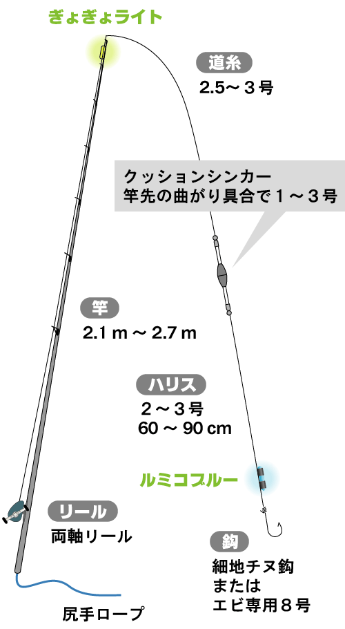 餌はアオイソメまたはシラサエビです。エビを撒いてポイントを作ることもありますが、大物狙いにはアオイソメの方が効くようです。