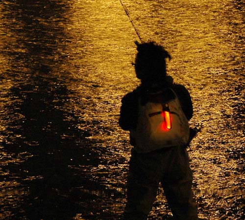 明るいうちから釣場に入れたら、まず高い場所から沈み瀬の状況を調べます。大物がたくさんいそうで、向かい風にならず、波をかぶらず、取り込みやすい場所に釣り座を決め、危険な場所には ケミホタル を置いてマーカーにします。