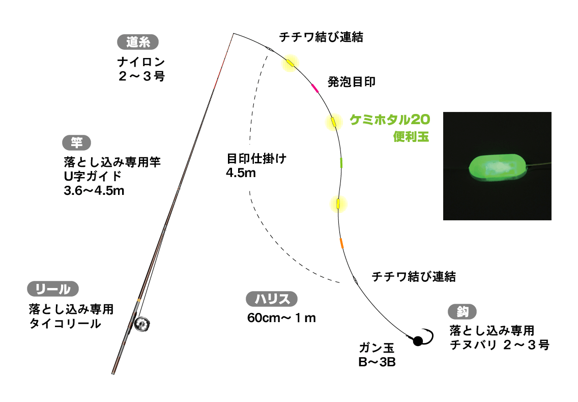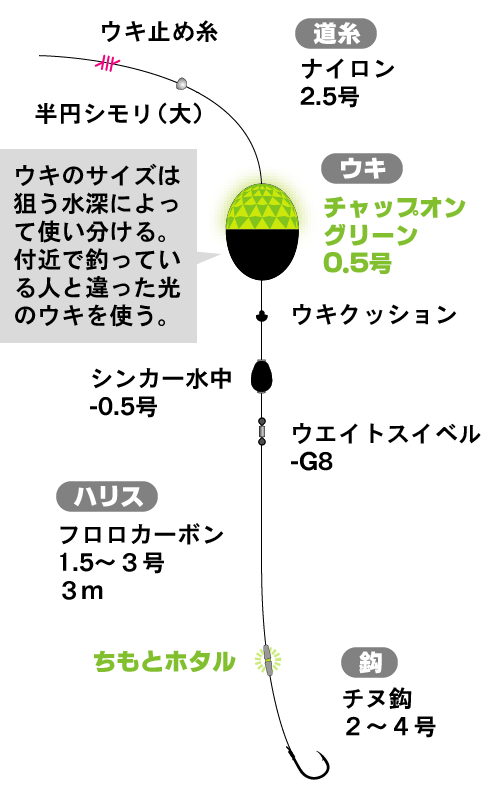 これはわたしの裏技ですが、昼間でも 8m 以上の深いタナをねらうときは、ちもとホタル をセットします。ハリスウキとして、底の方で動く微細な流れをつかんでエサを躍らせてくれるからです。ぜひ試してみてください。
