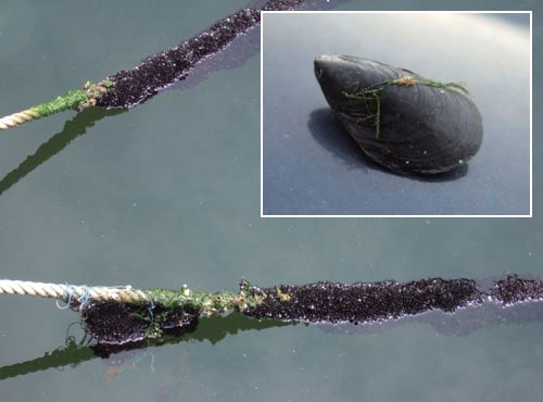 イガイは冬に産卵して夏には 4~10mm まで成長します。盛夏、岸壁にビッシリと貼り付いたイガイの層の中には、カニや子エビ、ゴカイのような虫が潜んでいて、クロダイはこれらのエサを補食するため堤防に寄りついています。イガイ自体もまだ殻が柔らかく、量も多いのでクロダイの主食級のエサになっています。岸壁を歩きながら、あたかもこれらのエサが落ちてきたかのように演出して喰わせるのが落とし込み釣りです。