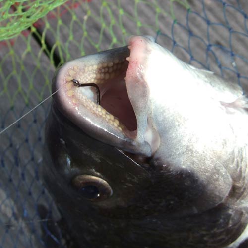 足元でヒットしたとき、クロダイは岸壁を向いているので、腕を前に突き出して竿を沖に振り出すようにアワセを入れます。このときイガイに仕込まれた鈎が、口の中を向いていれば、フックは上アゴに立ち込もうとします。しかし、良型の歯の裏は頑丈なためフックはなかなか立ち込まず、歯と歯のスキマに挟まった状態になりがちです。このままテンションをかけて沖に走らせると、うまくいけばフックが移動して口の横にフッキングします。