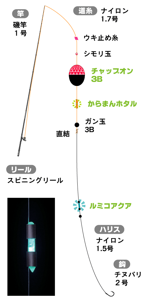 昼間の釣りとの決定的な違いはハリスの号数を大きくすること。最大で3号くらいまで使います。またハリの3~4cm上に 「 ちもとホタル 」 をセットします。これはハリの位置を判りやすくするためと、集魚効果を高めるためです。集魚効果についてはいまさら書くまでもありません。セットするとしないのでは、明らかにヒット率が違います。水中に生息している生物で夜になると発光する甲殻類や虫類が絶好のクロダイのエサになるからではないかと思われます。クロダイがエサもろとも、ちもとホタル まで呑みこんでいたことも珍しくありません。