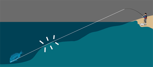 ラインに変化があったら、仕掛の弛みの分まで大きくアワセを入れます。アワセの衝撃はスプールを滑らせて吸収してください。水深がある場所でヒットしたときは底に、浅場でヒットしたときは沖の深みに走る傾向があります。オーバーハングの場所では足元に突っ込まれるので長竿で対応してください。引きのつよさで大きさを推し量り、大型ならスプールを指で押さえ、ドラグをかけながらラインを送りだします。動きが止まったところで引き寄せてください。