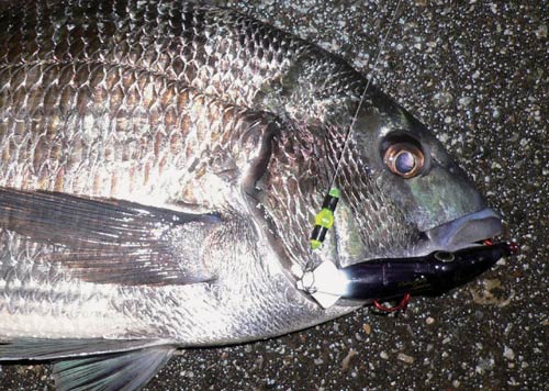 日中は警戒心がつよいクロダイも夜になると安心するのか、背ビレが出るほど浅い場所までやってきます。エサ取りが姿を消すのが大物回遊のサイン。ライトで海面を照らさない、物音を立てないなどに注意しながら、電気ウキを使ったシンプル太仕掛けで記録更新を狙ってください。