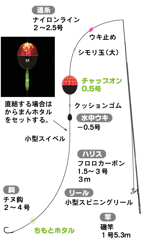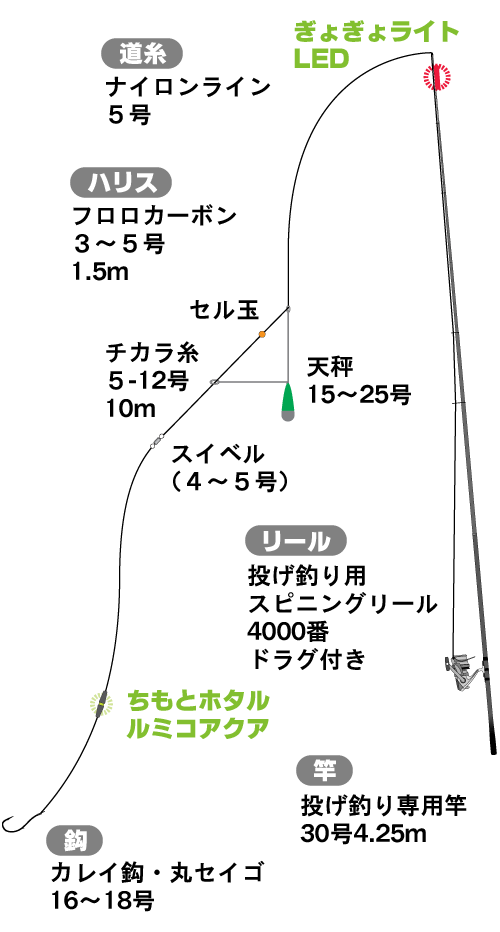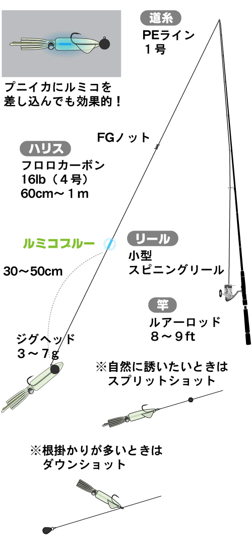 富山湾周辺では、産卵のために接岸したホタルイカを食べようと、クロダイやマダイ、大型メバルやキジハタなどの高級魚が岸近くまで寄ってきます。それらの魚を、ホタルイカの青い光を模した ルミコ を付けて狙うのがホタルイカパターン。生きのいいホタルイカは、敵に襲われたら墨を吐いて素早く逃げるので補食するのが大変です。そこで、補食されやすいよう、産卵が終わって弱ったホタルイカの動きを演出するのです。元気よく光るホタルイカは水面にいるので、仕掛け上部の明るい光でクロダイを寄せ、下に付けた暗くて弱った光で喰わせてください。 ※ テキサスリングについては ページ3の カサゴ編 プニイカテキサス をご覧下さい。